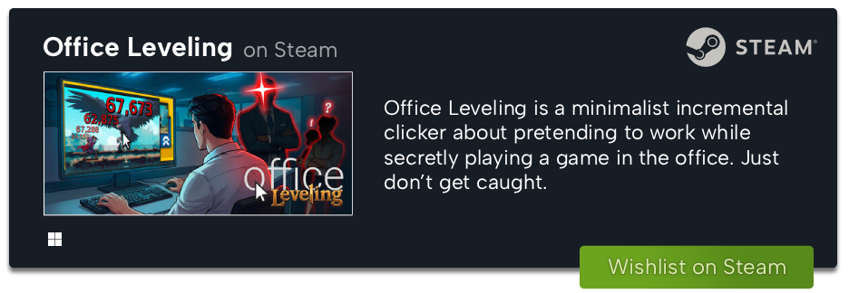 Office Leveling is a minimalist incremental clicker about pretending to work while secretly playing a game in the office. Just don’t get caught.